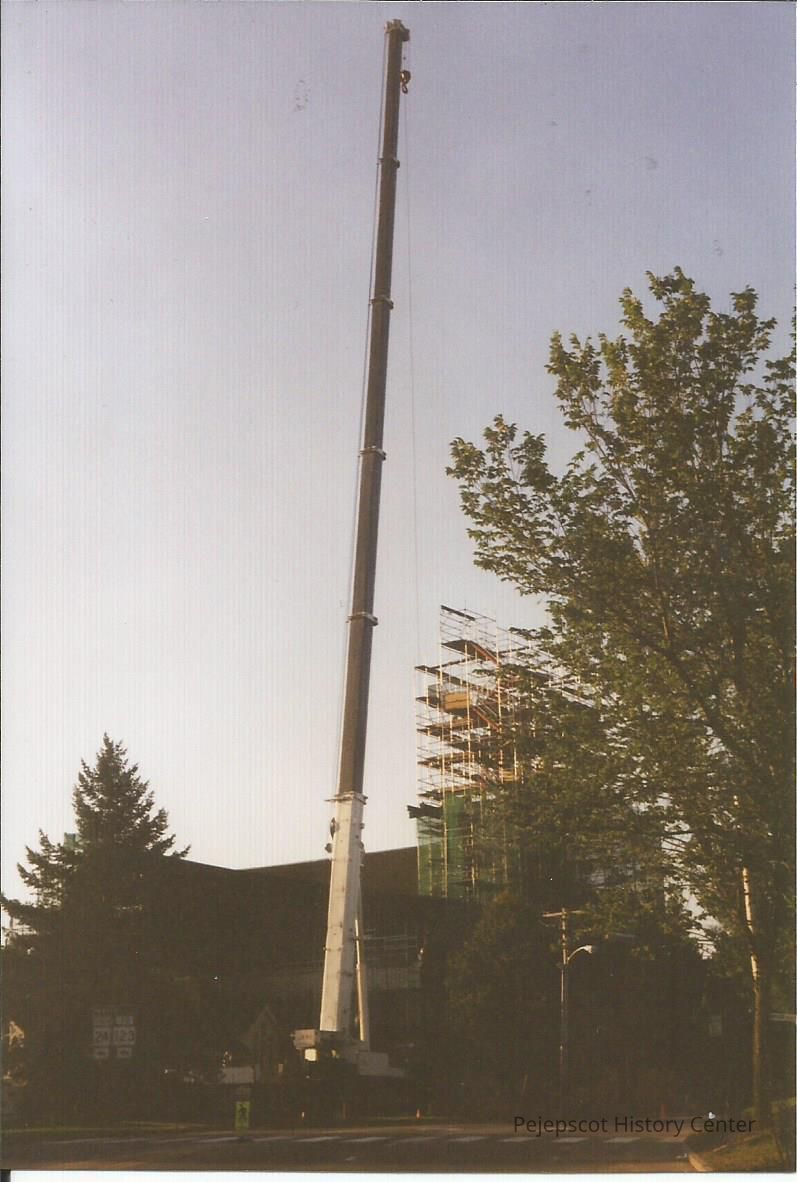 A color photograph of a crane in the sky beside the First Parish Church (Brunswick, ME) still under restoration. Undated.