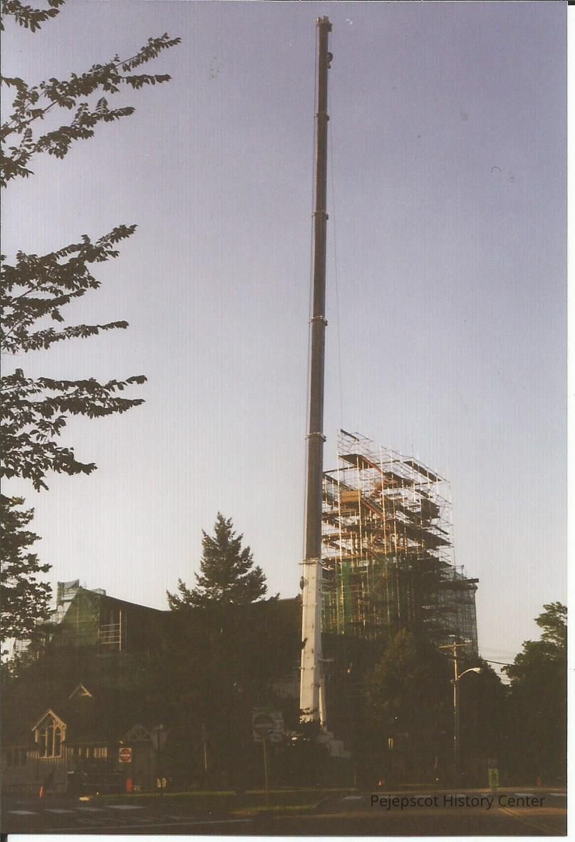 A color photograph of a crane standing in front of the First Parish Church (Brunswick, ME) during its restoration. Undated.