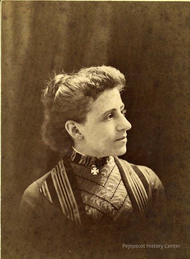 A sepia-toned photo of Kate "Kittie” Georgia Crawford (b. 2/10/1869, Portland, Maine). She is wearing a necklace with a Maltese cross on it. Photo taken by Geo. H. Van Norman, Waltham, MA. Photo is undated.