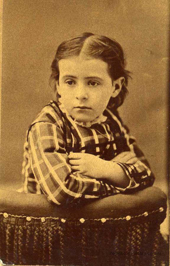 A sepia-toned photo of Kate "Kittie" Georgia Crawford (b. 2/10/1869, Portland, ME), age 6. Daughter George Ward (b. 1846) and Adaline Morrison Crawford. Photo taken by Wm. Pierce & A.O. Reed, Brunswick, ME in 1875.