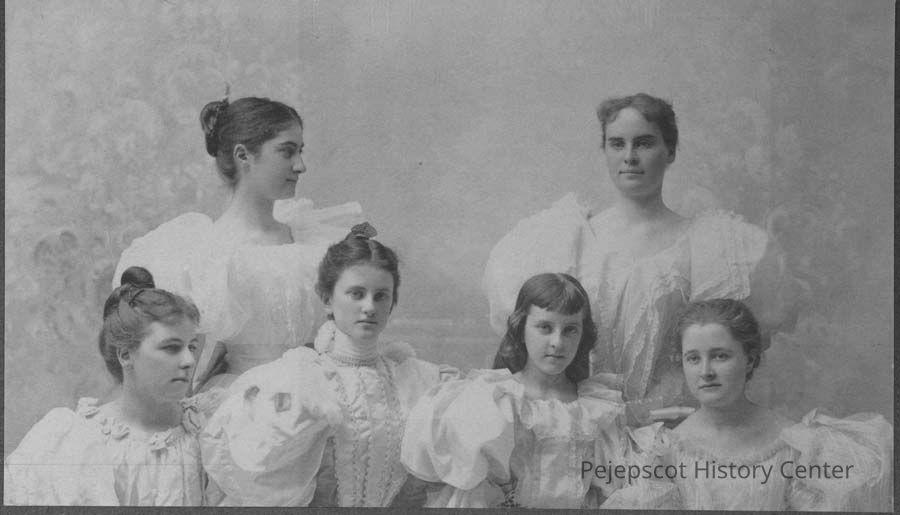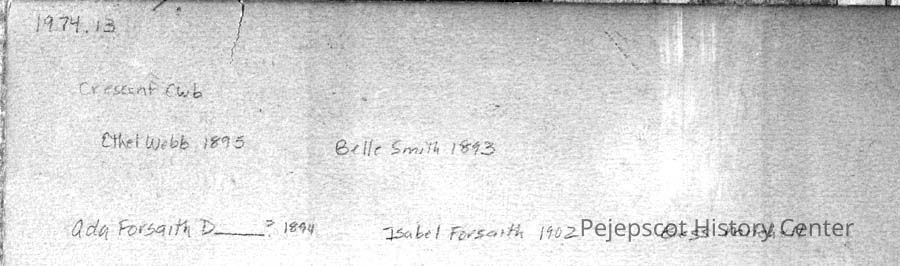 An undated B/W photograph of the Crescent Club. There are 5 women in the picture. (L to r) Ethel Webb (1895), Belle Smith (1893), Ada Augusta Forsaith (1894), Isobel Forsaith (1902) and Bess Mitchell. Given by Mrs. Wm D Ireland, Mere Point