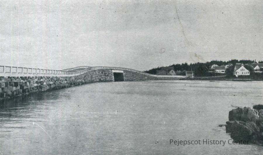 A B/W photograph of the Cribstone Bridge. "The Bailey Island Bridge, a reality after 60 years of agitation. The cob-pile construction to allow free flow of tide, has but one duplicate in the world, and that one is in Scotland."
