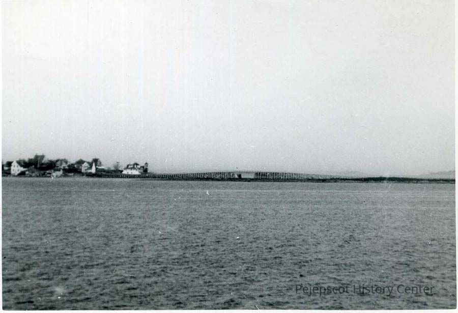 A black and white photo of the cribstone bridge, Bailey Island, Maine taken from Stover's Point, Harpswell, Maine. Dated 10/20/1947.
