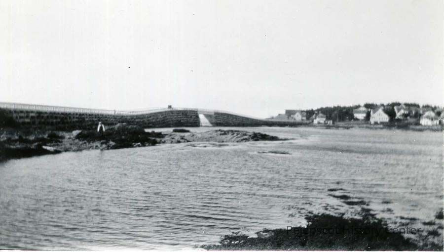 A black and white photo of the Cribstone Bridge dated September 9, 1928. Harpswell, Maine.