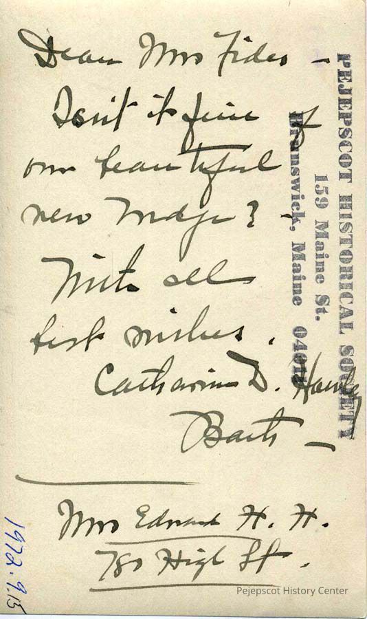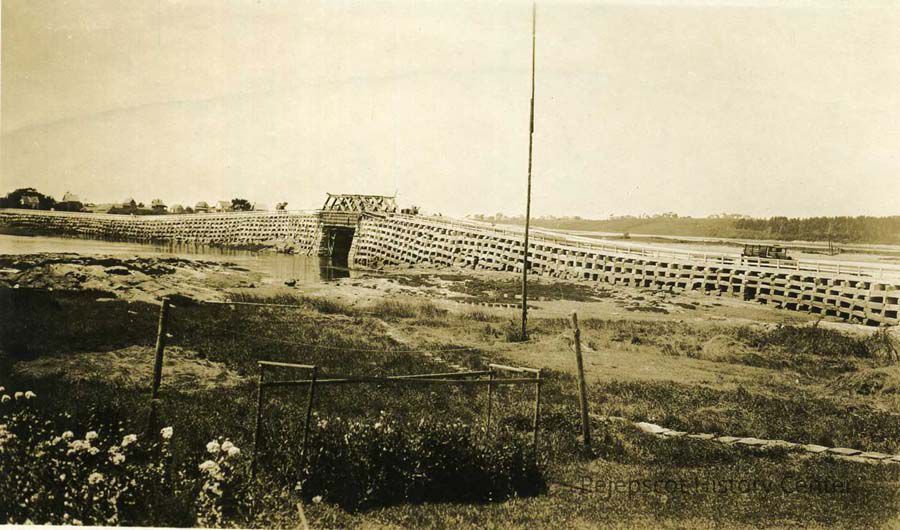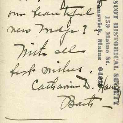 An undated sepia-toned photo of the Cribstone Bridge, Harpswell, Maine. On reverse of photo is a handwritten note (see image management).