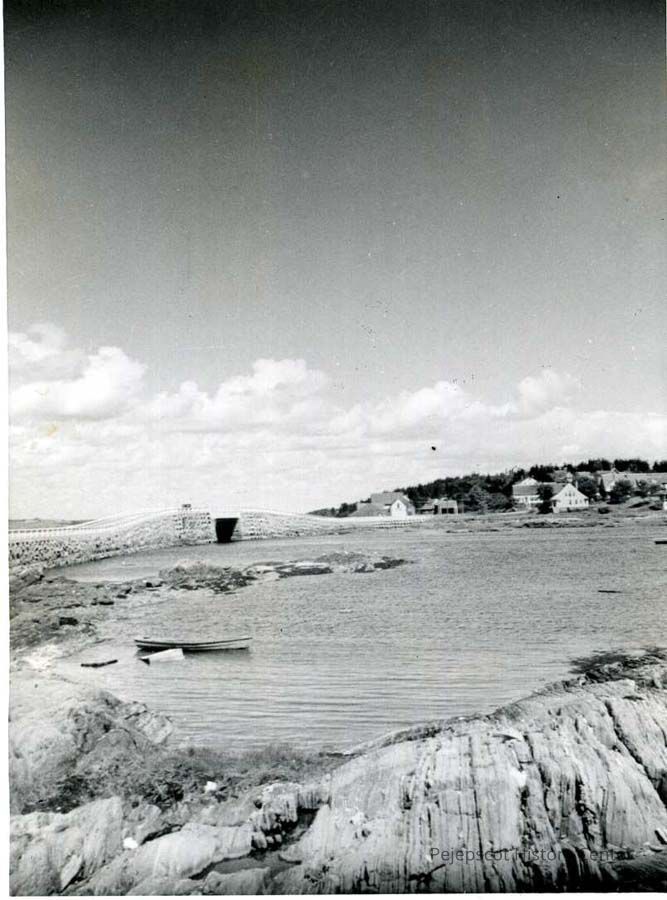A black and white photograph of the Cribstone Bridge between Orr's & Bailey Islands, ME. The photo was taken from Bailey's Island at "Mr. Palmer's & my parent's picnic." Undated.