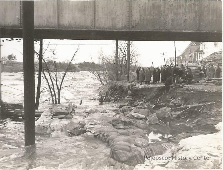 A B/W photograph of a crowd looking at the damage to the Black Bridge after the flood. Trees are seen half submerged as people work with pipes on the right side. Taken on Mill St, Brunswick, ME. Undated, speculated from the time around the 1936 flood.Lexicon