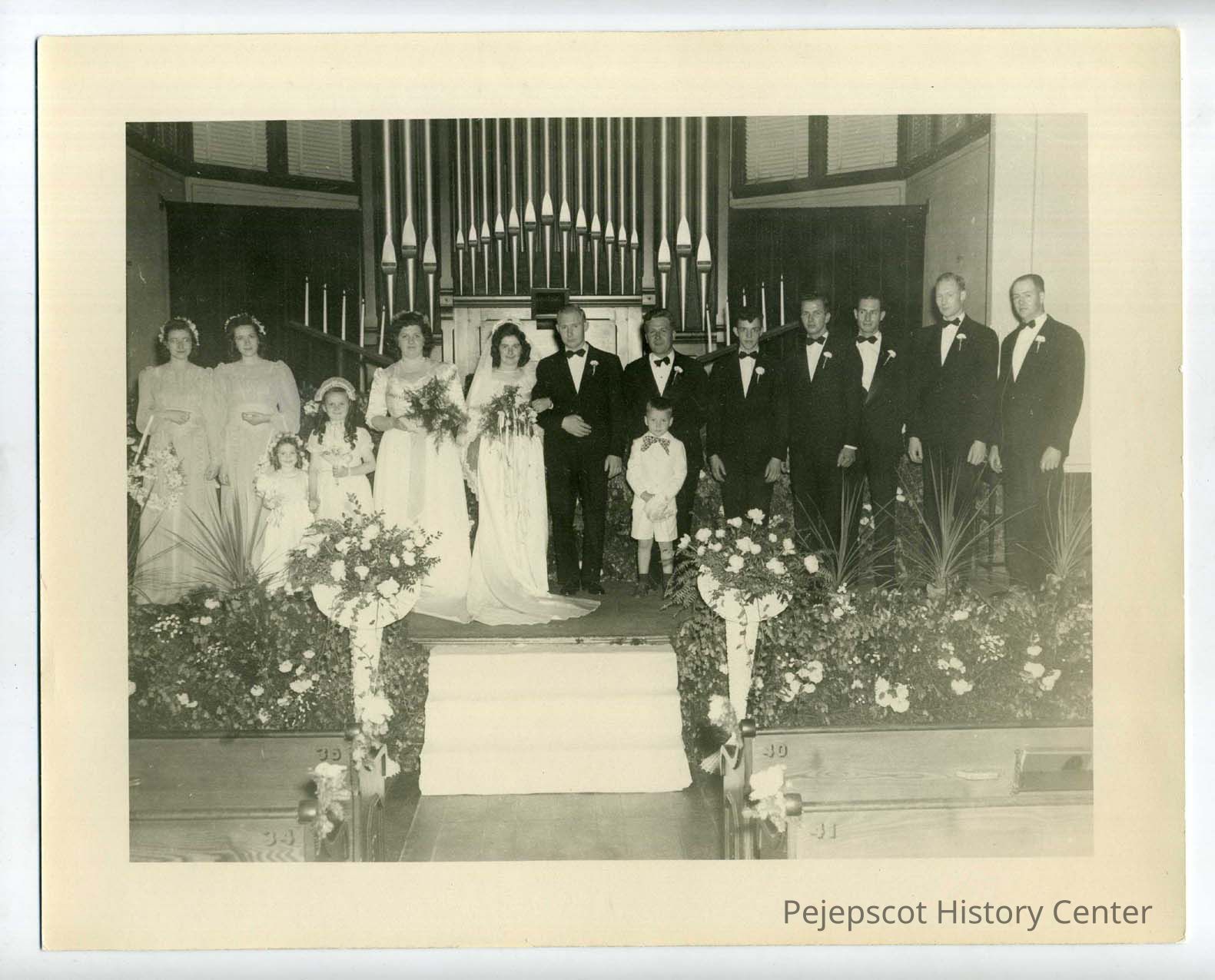 Photo of the Crystal Neoda Nougler and George C. Rollins wedding party in the church. Undated