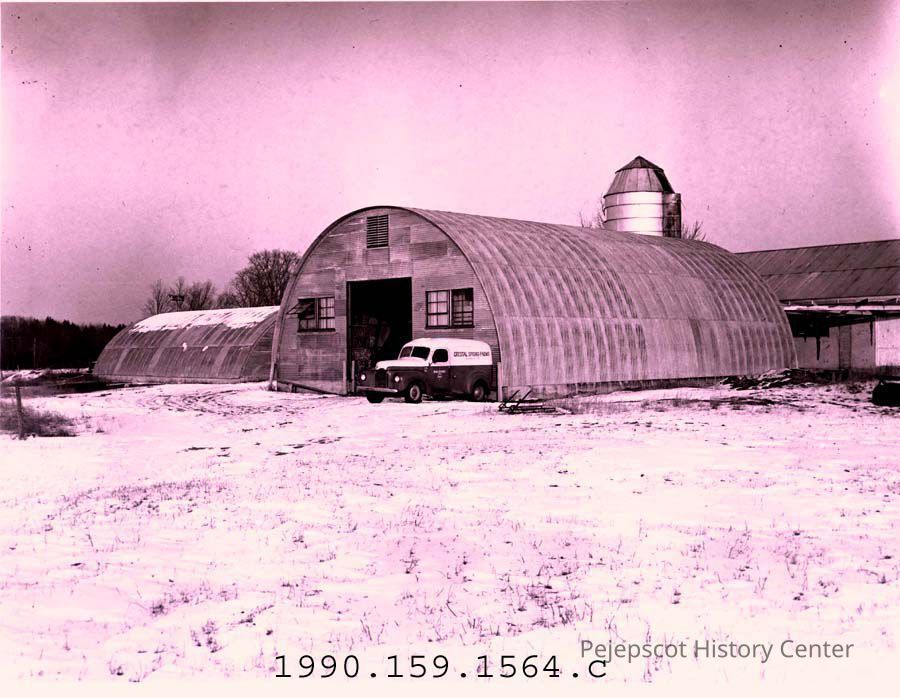 An undated B/W photograph of a quonset hut style barn at Crystal Springs Farm, Pleasant Hill Road, Brunswick.