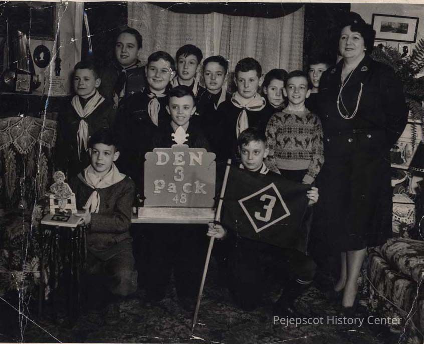 An undated black and white photograph of Cub Scout Den 3, Pack 48. The den mother is Jean Louise Tardif and one of the scouts is Leo Caron.