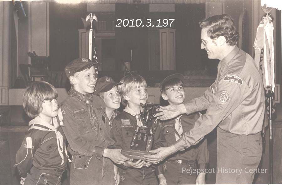 A B/W photograph of Cub Scout Pack 648 receiving a trophy from Larry Tondreau. Photo published 5/22/1973. Undated