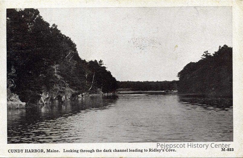 An undated postcard of "Cundy Harbor, Maine. Looking through the dark channel leading to Ridley's Cove." Postcard Number M-823.Lexicon