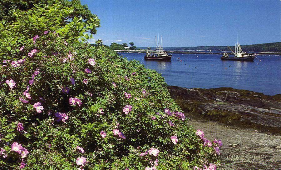 A color postcard of fishing boats in Cundy's Harbor, c. 1990.