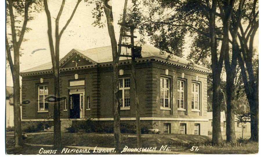 A sepia postcard photograph of the Curtis Memorial Library, Brunswick, ME. Not dated.