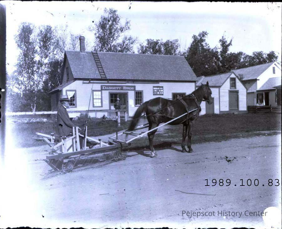 A B/W photograph of a farmer in front of Daggett Bros. Store, 16 Winter Street, Topsham. The farmer is sitting on a very small wagon which is being pulled by a horse. This is a duplicate of the photo 2004.126.1.