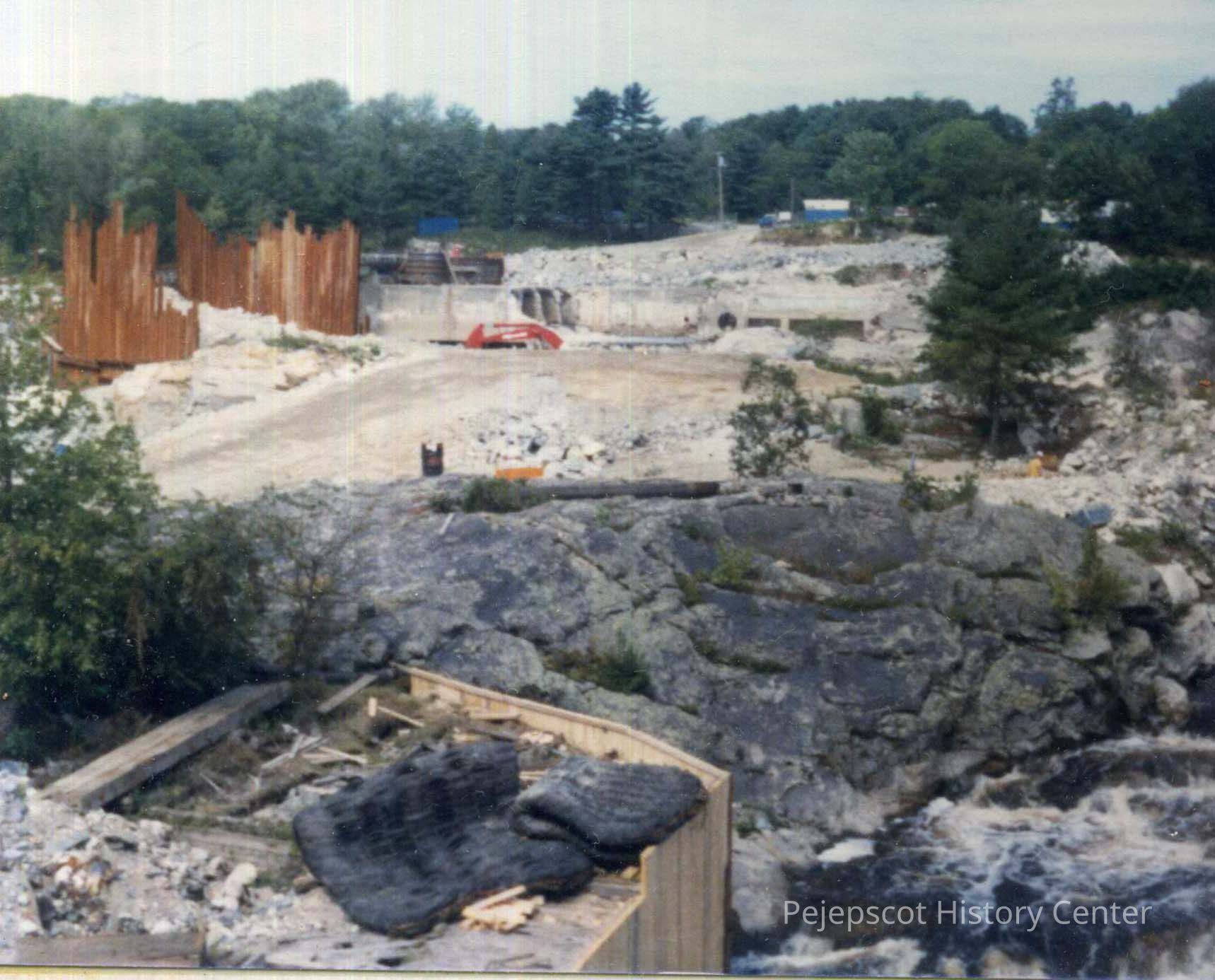 A color photo of the dam construction on the Topsham side. Undated