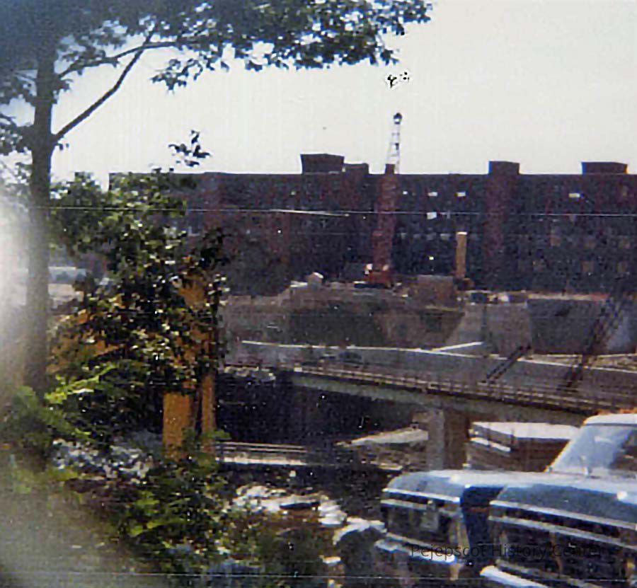 A color photo of the construction site as seen from the Topsham side. The Cabot Mill is in the background. Undated