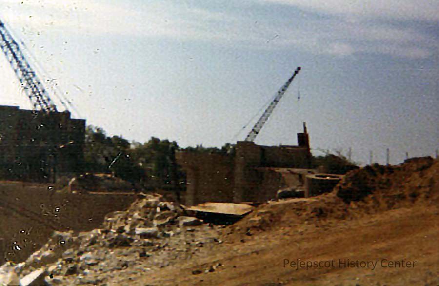 A color photo of the dam construction site with the two cranes in view. Undated
