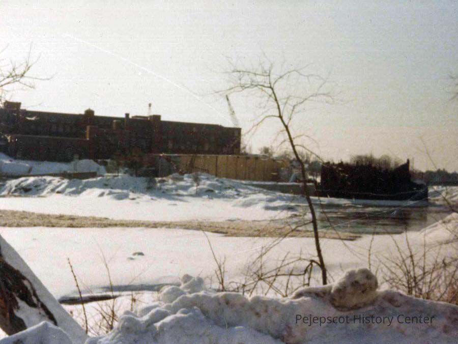 A color photo of he dam construction after a snow storm. 01/08/1981
