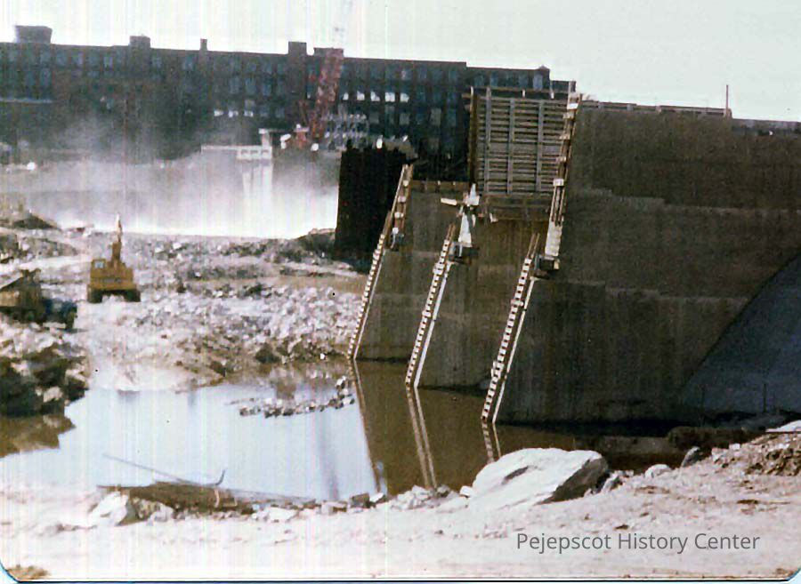 A color photo looking across the dam construction site from the Topsham side to the Brunswick side. The Cabot Mill can be seen in the background. Undated