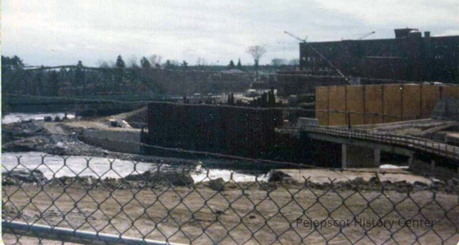 A color photo of the dam construction site from above. Photo taken from the Topsham side. The Frank J. Wood Bridge can be seen in the background. Undated