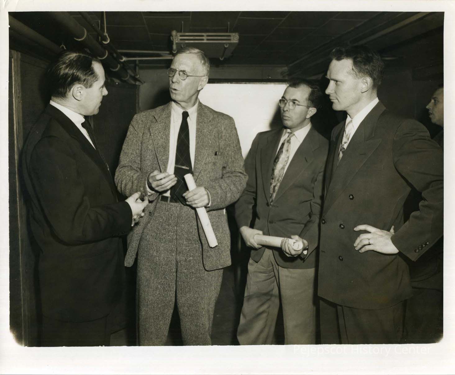 Four men stand in what looks like a basement. The third man from the left is Dana Wallace. The photo may have something to do with Sea and Shores. Undated