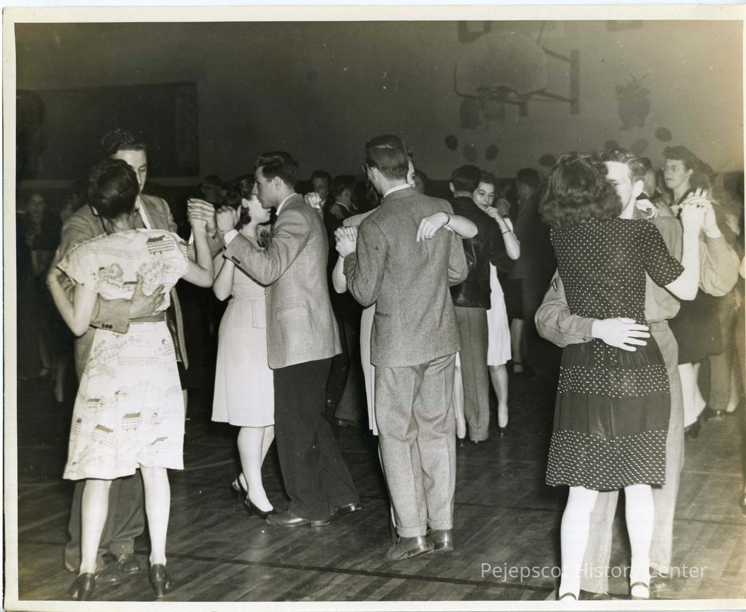 Five couples are dancing in the 1940s. The woman in the center facing the camera is Marion Cheetham of Topsham. Undated