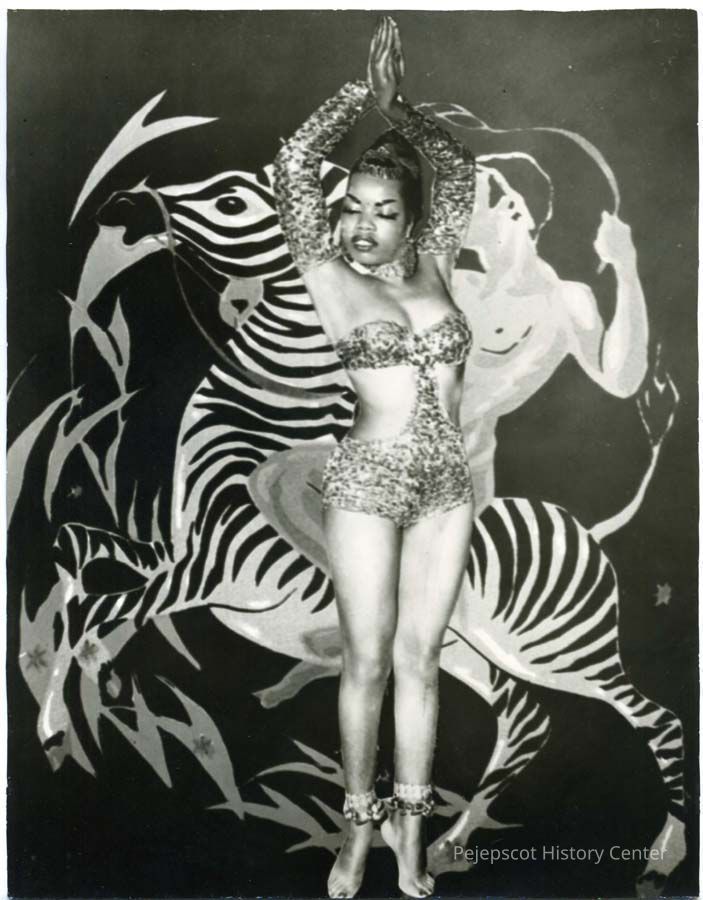 An undated black and white photograph of a woman, presumably a dancer, standing in front of a painting of a zebra. The photograph taken by Emile of Montreal Photographe. This is one of 19 photographs of entertainers at the State Hotel, 192 Maine Street, Brunswick. The photographs have been removed from their frames.