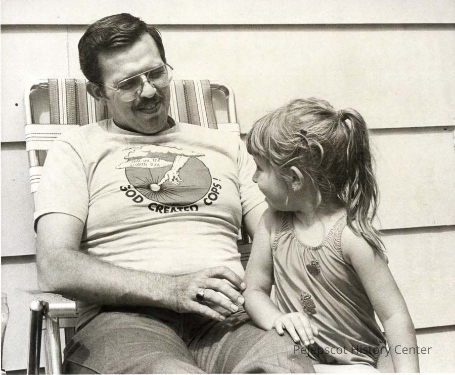 A black and white photo of Topsham Police Chief Daniel Parlin and his daughter Jennifer. This is another view of Parlin and his daughter (2003.546.3.342) that was published in The Times Record in Brunswick, Maine.