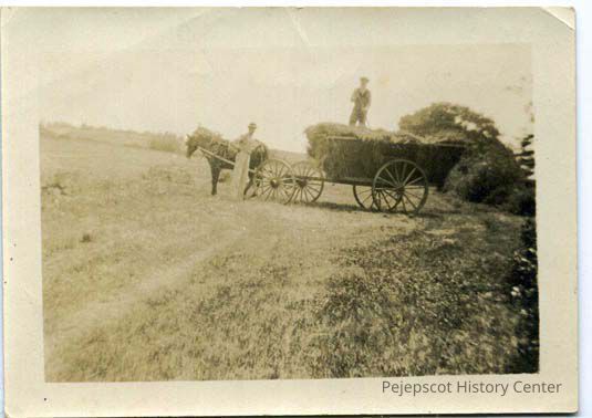 An undated black and white photograph of Daniel R. Stover and Daniel R. Stover and Horatio Merrill with a hay wagon and a horse named Clytemnestra.