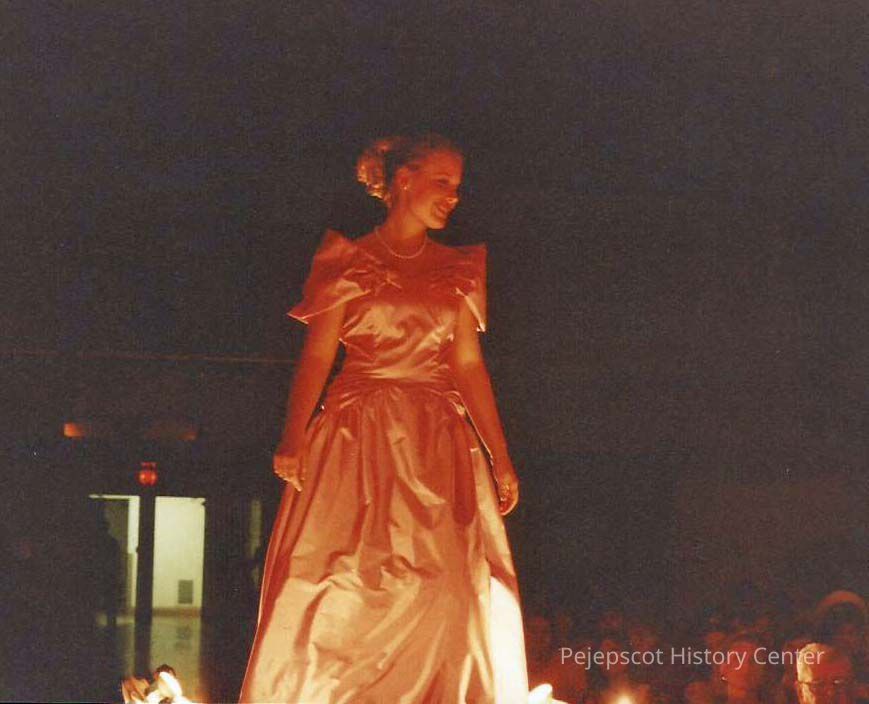 A color photograph of Darby Labbe taking her walk down the ramp. Photographer's # 4-10 CYO sponsored