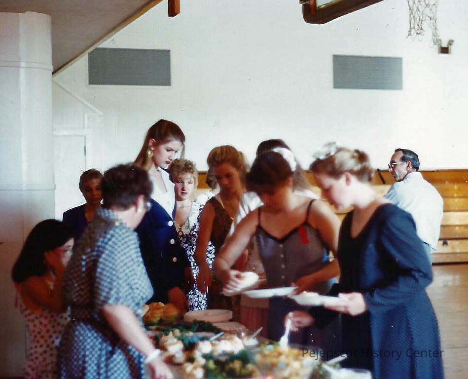 A color photograph of Darby Labbe, Courtney Garrison, Lisa Kelly, Kristen Stevens, Michele Byras, Corrie Pottle picking up food while Linda Dodson & Katherine Albano are looking on.