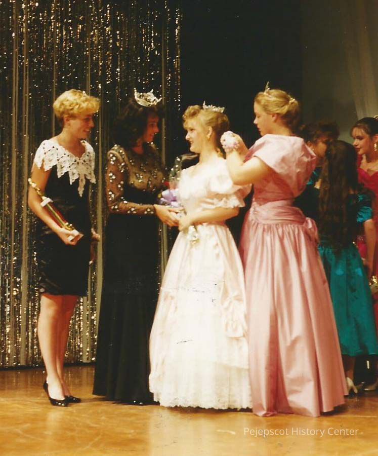 A color photograph of Darby Labbe crowning Michele Byras while Katherine Albano & Robin Moody are talking to her.