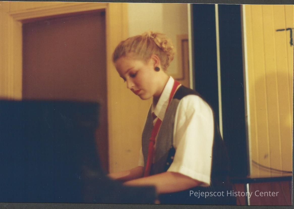 A color photograph of Darby Labbe, participant # 6 who is playing the piano for her talent.