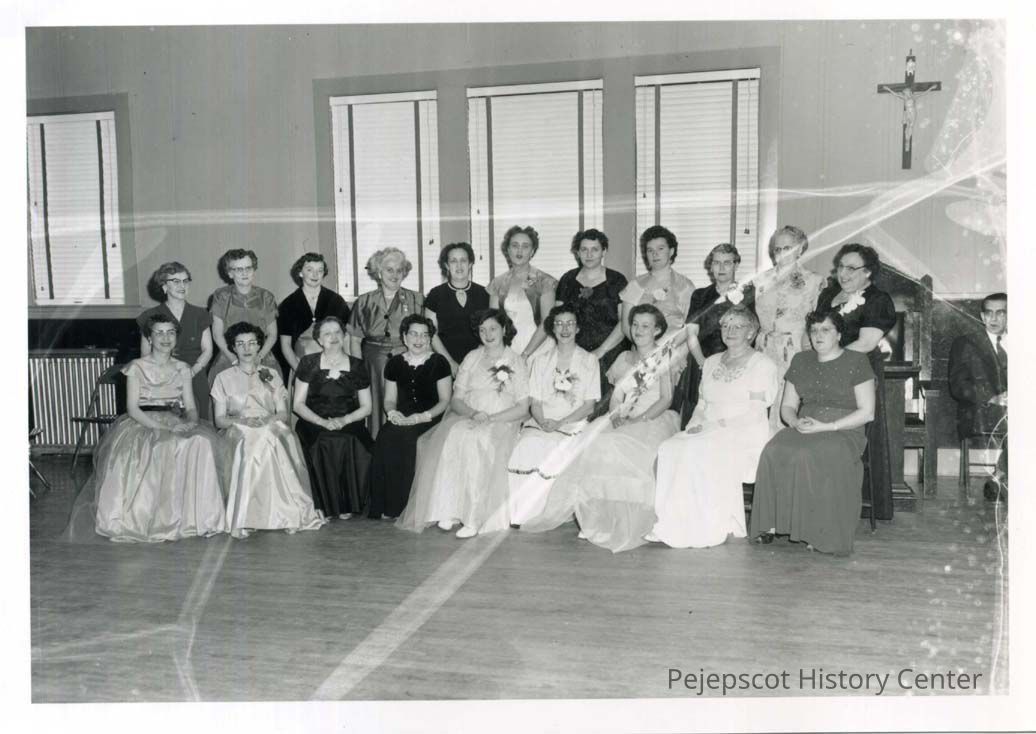 This photo shows twenty Daughters of Isabella posed for the camera in formal dress.