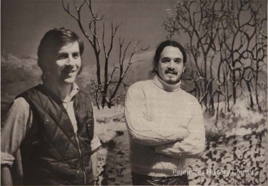 A black and white photograph of artists Dave Rosenthal and Andy Swift standing in front of a mural they painted. They are the artists of the Fayve Shoe Store mural in Cook's Corner pictured in 2003.546d.4214.a.