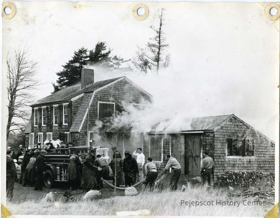A black & white photograph of a fire at Edith Davenport's house on Mere Point Road, Brunswick, ME. A crowd of firemen and family are looking on.