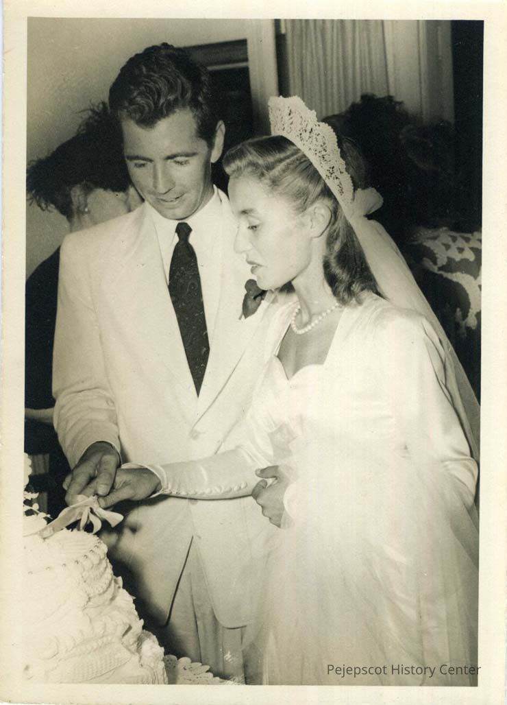 Bride and groom cutting the cake at the David and Paula Burnett wedding. Undated