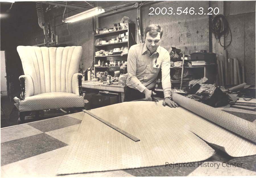 A black and white photograph of Dave Frost, owner of Dave's Custom Upholstery in Topsham, was published in The Times Record in Brunswick, Maine, on 2/4/1982.