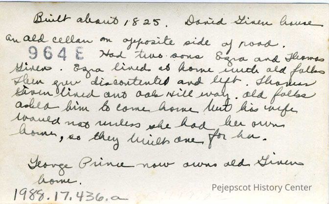 An old cellar on opposite side of road. Had two sons Ezra and Thomas Givens Ezra lived at home with old folks then grew discontented and left. Thomas Given lived out Oak Hill way. Old folks asked him to come home but his wife would not unless he had her own home, so they built one for her. George Prince now owns the old Given home".