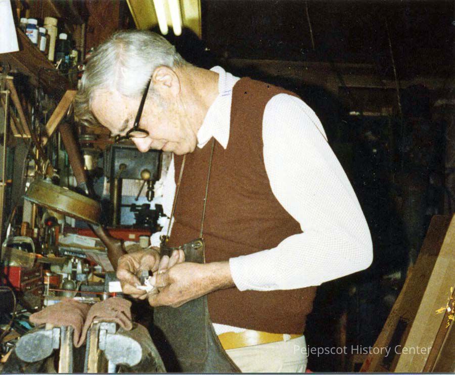 Color photo of David Purinton, owner of the Brunswick Gun Shop, 31 Bath Road, Brunswick, at work at his shop. 1990.