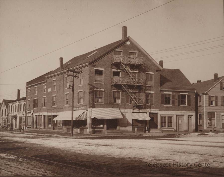 A B/W photograph of the Day Block (St. Onge Block) on the corner of Mason and Maine Streets. Undated