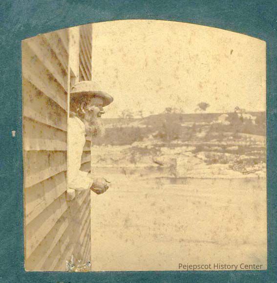 A B/W photograph of Deacon David Scribner looking out a window of the old Scribner Mill located at the Brunswick end of the Frank J. Wood Bridge. Brunswick, ME. Not dated.