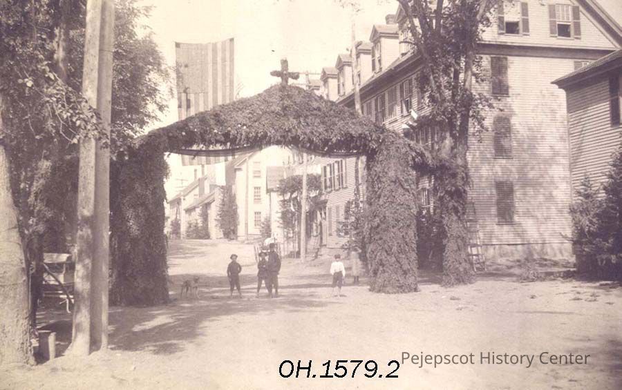 Decorative arch on Mill Street corner of Union Street, looking west, Brunswick, ME. It was for the celebration of St. John's Day, 1894 by the Catholic Society of St. John the Baptist. A corner of the old Giddings House can be seen as well as the Cabot Co. house opposite Union Street. Undated