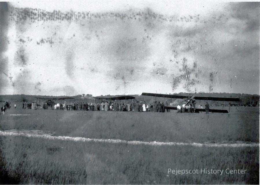 A B/W photo of three planes and a crowd at the dedication of dedication of the Brunswick Aviation Field. 6/12/1922