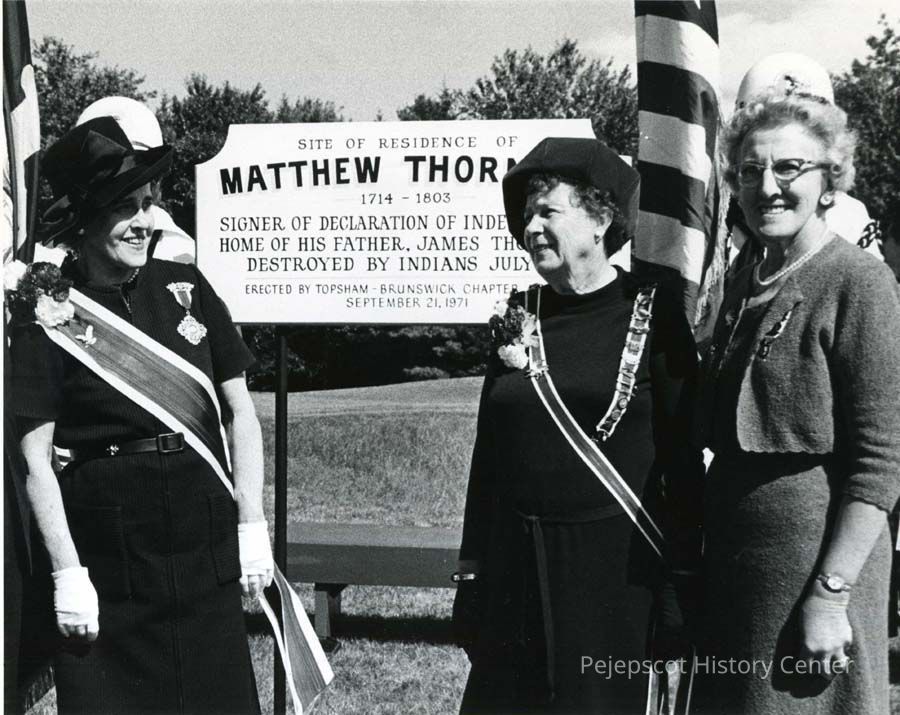 B/W photo of the dedication of a sign at the residence of Matthew Thornton, erected by the Topsham-Brunswick Chapter of the National Society of the Daughters of the American Revolution. Pictured at left Mrs. Donald Spicer President General of the NSDAR. At the extreme right is Mrs. Charles H. Grout, Regent of the Topsham-Brunswick branch of the NSDAR. 9/21/1971.