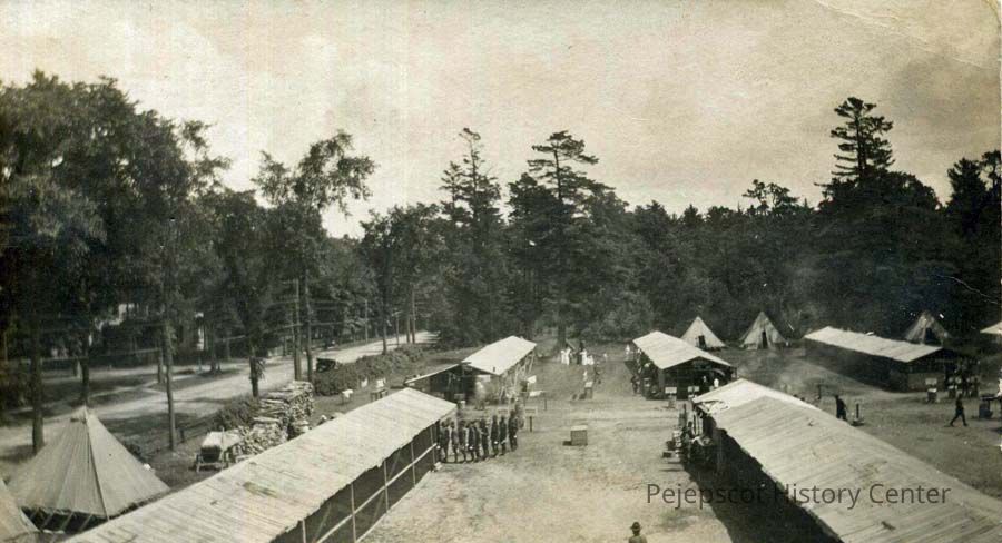 B/W photo of the Delta at Bowdoin College with a military encampment. No date.
