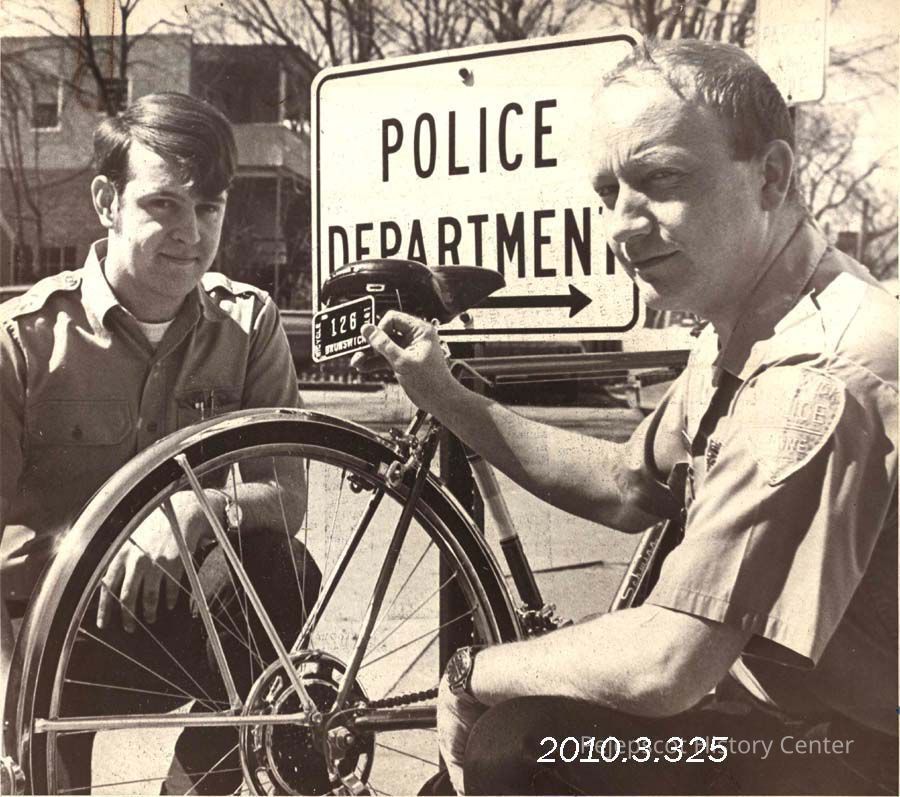 A B/W photograph of Brunswick Police officer Ronald Thomason showing Dennis Bernier how to attach his bicycle license plate. Marked on the back, "Dennis Bernier." No clipping. Undated