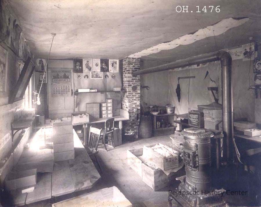 An undated B/W photograph of, "The room in which the first jeweler's boxes were made in the United States. In barn of Dennison house on Everett St," Brunswick, Maine.