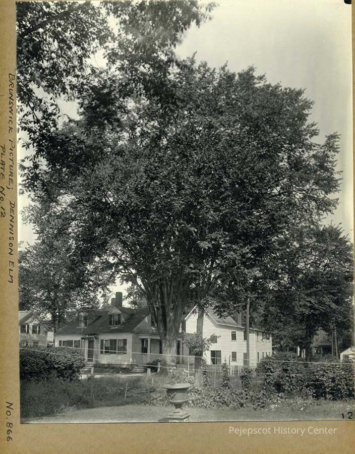 A black and white photo of the Dennison Elm and the front and side of the Dennison home. The photo is taken from across the street in another yard. Undated